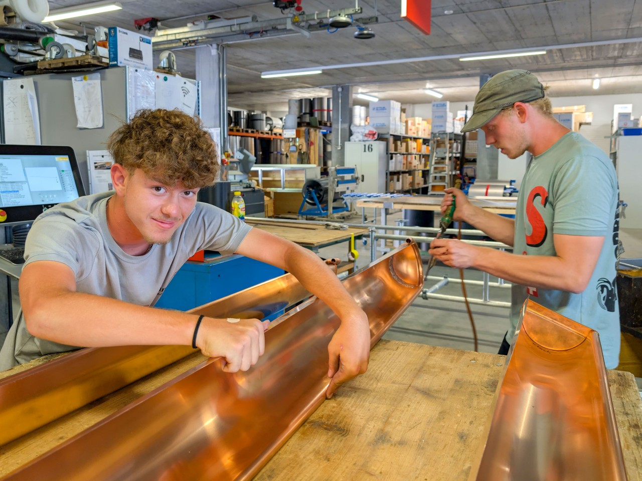 A seconda delle condizioni meteorologiche, una giornata tipo inizia in cantiere con il montaggio di elementi sagomati, misurazioni e adattamenti. In officina vengono realizzati profili in lamiera, a cui seguono disegni con software CAD o lavori su macchine moderne. L'obiettivo è quello di sperimentare l'intera gamma di attività artigianali, dalla precisione manuale alla realizzazione digitale. Gli apprendisti e le apprendiste sono affiancati da un team affiatato: oltre al capo junior, Dani e Orlando, caposquadra lattonieri, si occupano quotidianamente della formazione.